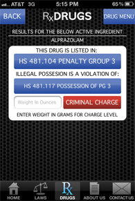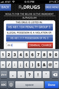 When pills are encountered on the street it can be difficult to determine if the drugs are controlled, require a prescription or are over-the-counter. PolicePal can instantly identify the pill by its imprint. Information that will be provided is: the brand name, active ingredient, description, DEA control status and picture. In addition, PolicePal will provide any associated Texas penalties for illegally possessing the drug.