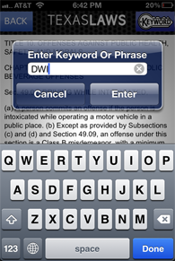 Laws can be easily saved for quick reference by selecting the keyword button, which allows users to type in a keyword or short phrase of their choice. The keyword will be saved specifically to that user's phone in multiple ways. Laws will be saved into a "My Keywords" section, which can be accessed from the main Law Menu. The keyword will also become active in search bar results as well.